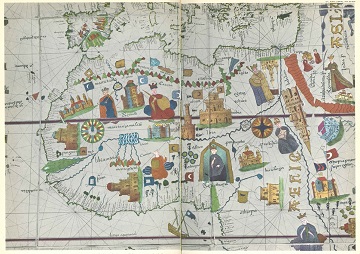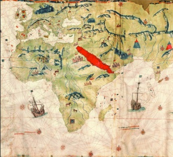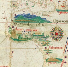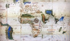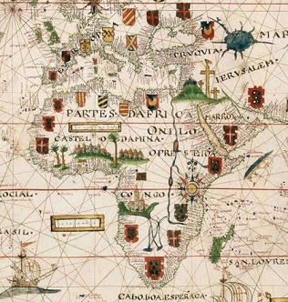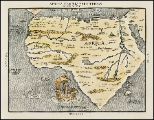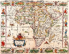 Early maps of Africa's unknown interior parts also show a strong influence by Ptolemy until well past the 17th century, who claimed in antiquity that the Nile river originated near the Mountains of the Moon in the far South (thought to be referring to the Ruwenzori Mountains) in the vicinity of two lakes, which the first maps of Africa by Juan de la Cosa (1460-1510) and Juan Vespucci (1454-1512) reflect. While the odd Pygmee from central Africa was somehow brought to the early Egyptians (Choefor) and Romans, as curiosity and source of wonder, his origins remained a mystery. Early maps of Africa show exotic animal cartouches, which once roamed north Africa in large numbers. Its distant coasts were first charted by Portuguese sailors Dias (1487/88AD) and da Gama (1498AD), (and attention diverted away from it by Columbus in 1492AD), and whose interior did not lightly give up its secrets, until the 20th century.