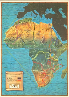 Then, for most of the past half millennium, the Muslim Ottomans, Barbary pirates and the Sahara desert kept Africa from being explored from the North, which led Europeans, in particular the Portuguese, to round Africa instead, mapping its coast lines in detail, but not its interior, which remained unknown even in 1855 (see below maps of that late period: no great lakes, no long rivers, and wrongly placed mountains), and sub-Saharan (West!) Africa labeled as 'Soudan', Central Africa (Congo!) as 'Ethiopia' (which in Greek simply meant 'burned' or 'black Africa'), Angola colonized by the Portuguese since 1575 still shown as 'Lower Guinea' on British maps, and the Transvaal unmarked still until some 10 years later. In 1788 the African Association had been formed in Britain to sponsor expeditions to Africa. With the abolition of the trans-atlantic slave trade in 1808, interest in Africa grew. The Parisian Geographical Society was launched in 1821. People were fascinated by fabulous stories of Timbuktu and its promises of gold (it turned out to be a barren desert trading town, and the gold remains well hidden to this day). With a view to potential commerce, the big African rivers were explored by the British and the French, under much hardships, and to much surprise! Turns out, that Ptolemy in 150AD was not that far off with his course of the Nile, the Great Lakes and the Ruwenzori mountains, as confirmed by Burton and Speke's expedition of 1858! It turns out that Ptolemy was not too far off in 150AD with the course of the Nile, the Great Lakes and the Ruwenzori mountains!