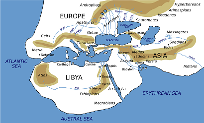 The continent of Africa was for a long time kept safe from exploration by the mistaken belief of early Greece, India and China until the 17th century, that the earth was flat (as a dish), encircled by a river called 'Okeanós' (Latin 'Oceanus' = 'ocean' = 'the great stream that encircles the earth'), from which 'the sun & stars rose, and into which they descended'. Earlier Greek mythology supposes a flat earth as in the quest for the Golden Fleece, dating from around 1300BC, 'which hangs from a tree at the end of the world, the prize of the gods', pursued by Jason, 'from the [other] end of the earth'. Greek poet Homer in the 8th century BC describes the flat earth thus, surrounded by a mythical river Okeanos, in his Iliad and Oddyssey. The poet Eumelos sets the adventure in the kingdom of Aia, at the eastern edge of the known world, so the Black Sea. The Greeks did not venture beyond the straights of Gibraltar until well after 600BC (long after the Hamitic Phoenicians, in modern parlance referred to as 'Asiatic'). We know, however, from Greek historian Herodotus (585-425BC) that the ancient pre-Arab Egyptians appear in 455BC to have successfully rounded the African Cape in a three year journey, ref. p4 in Stigand's 'the Land Of Zinj', which did not necessarily contradict the notion of a flat earth.